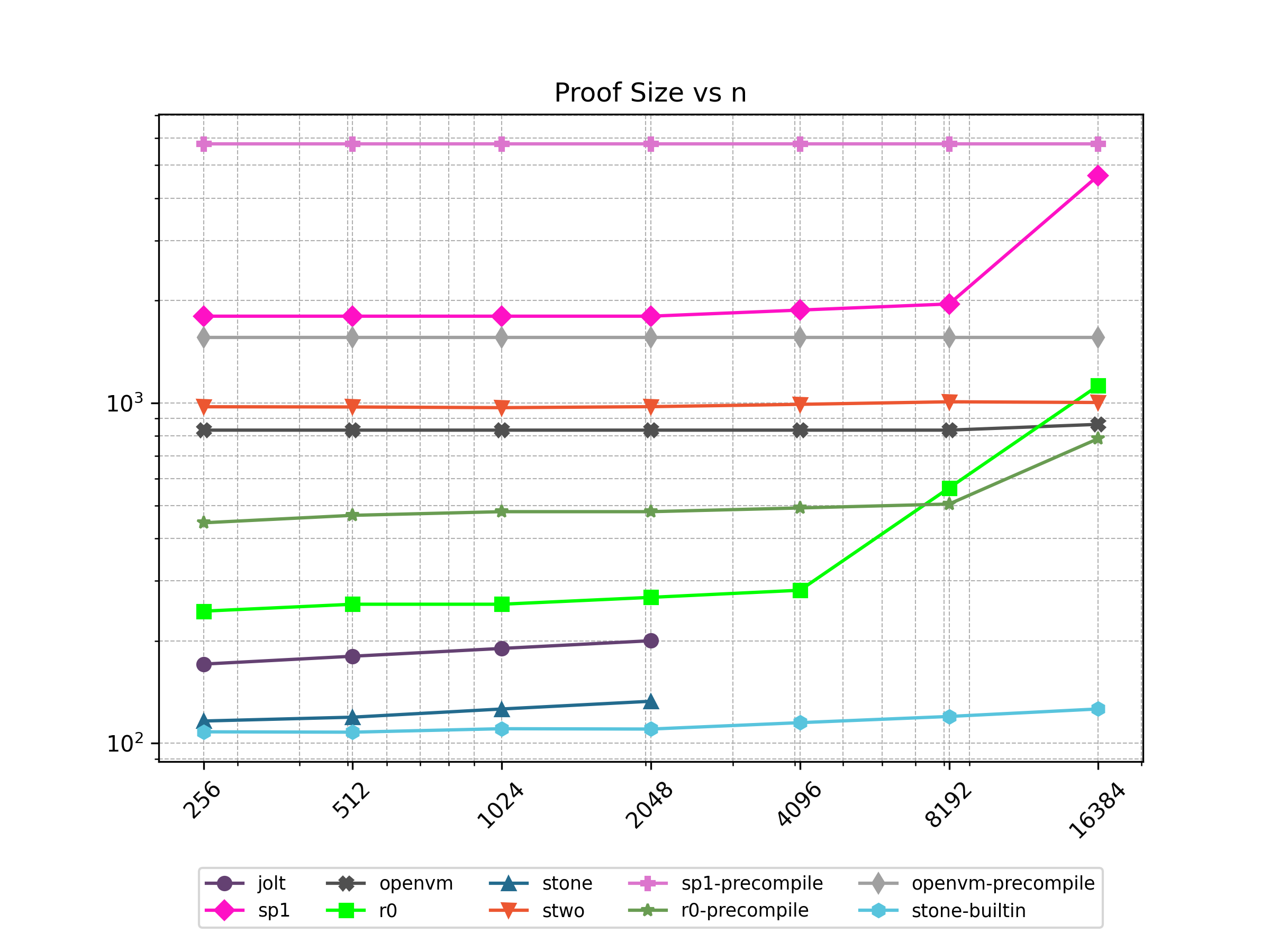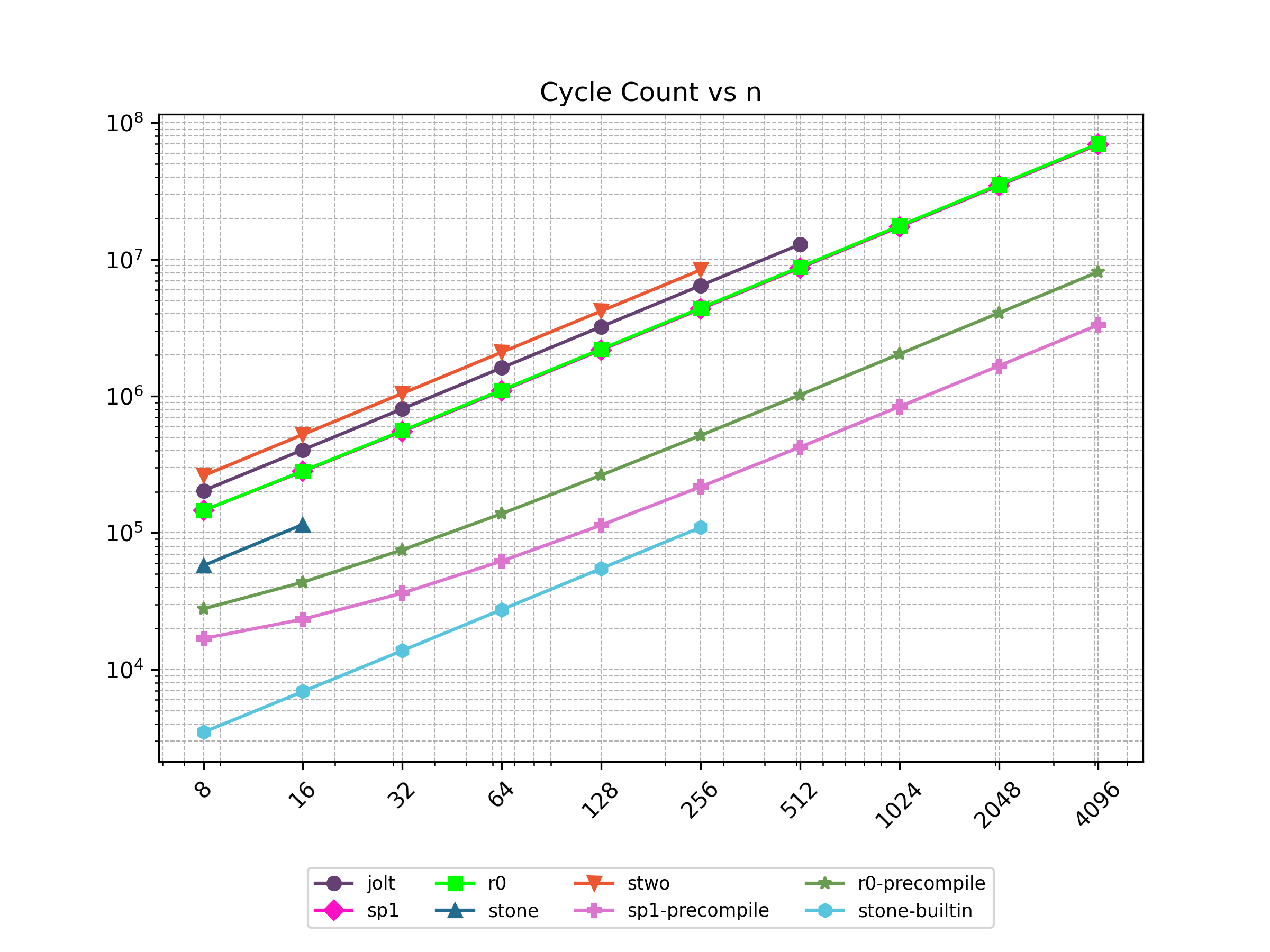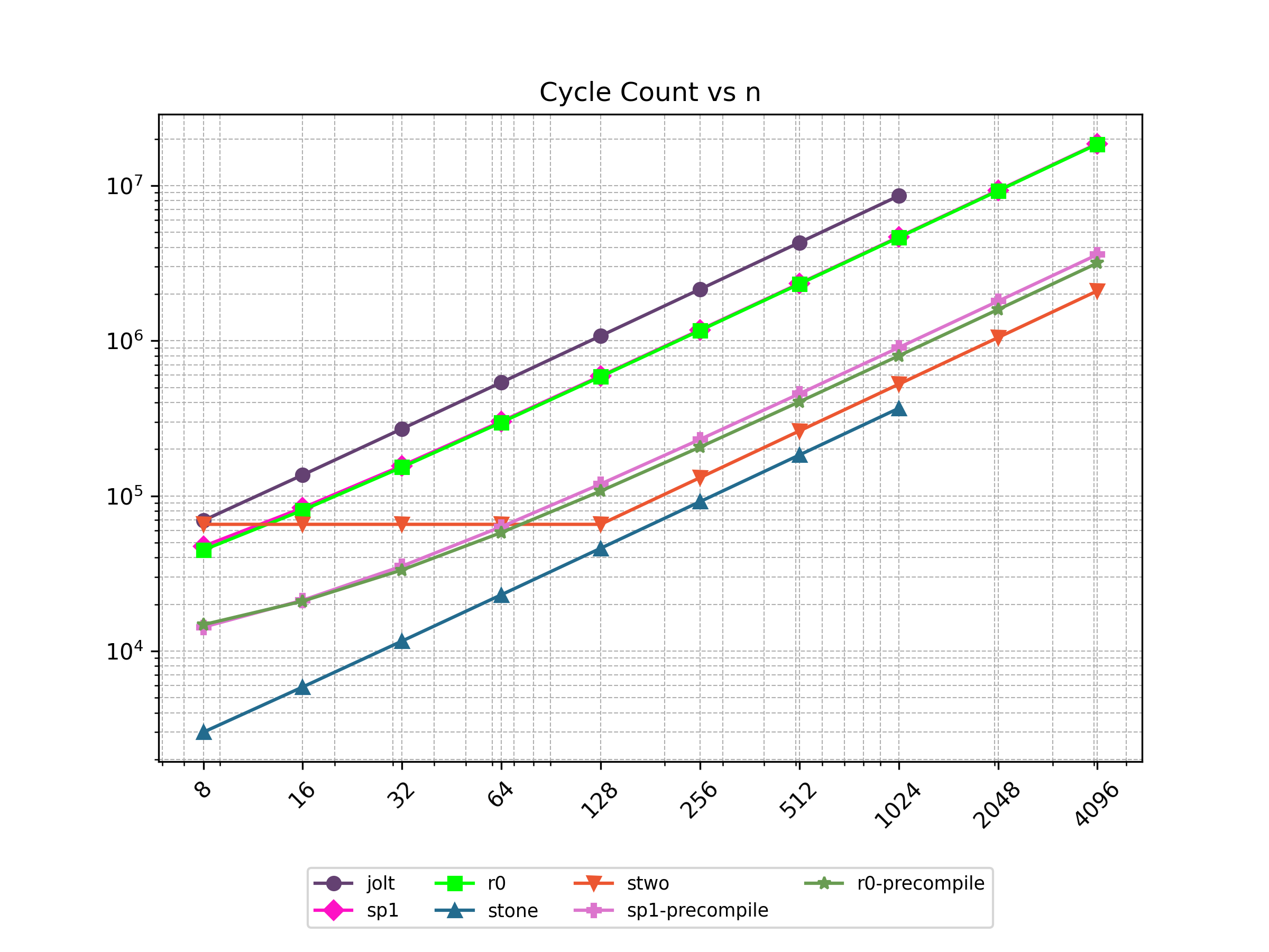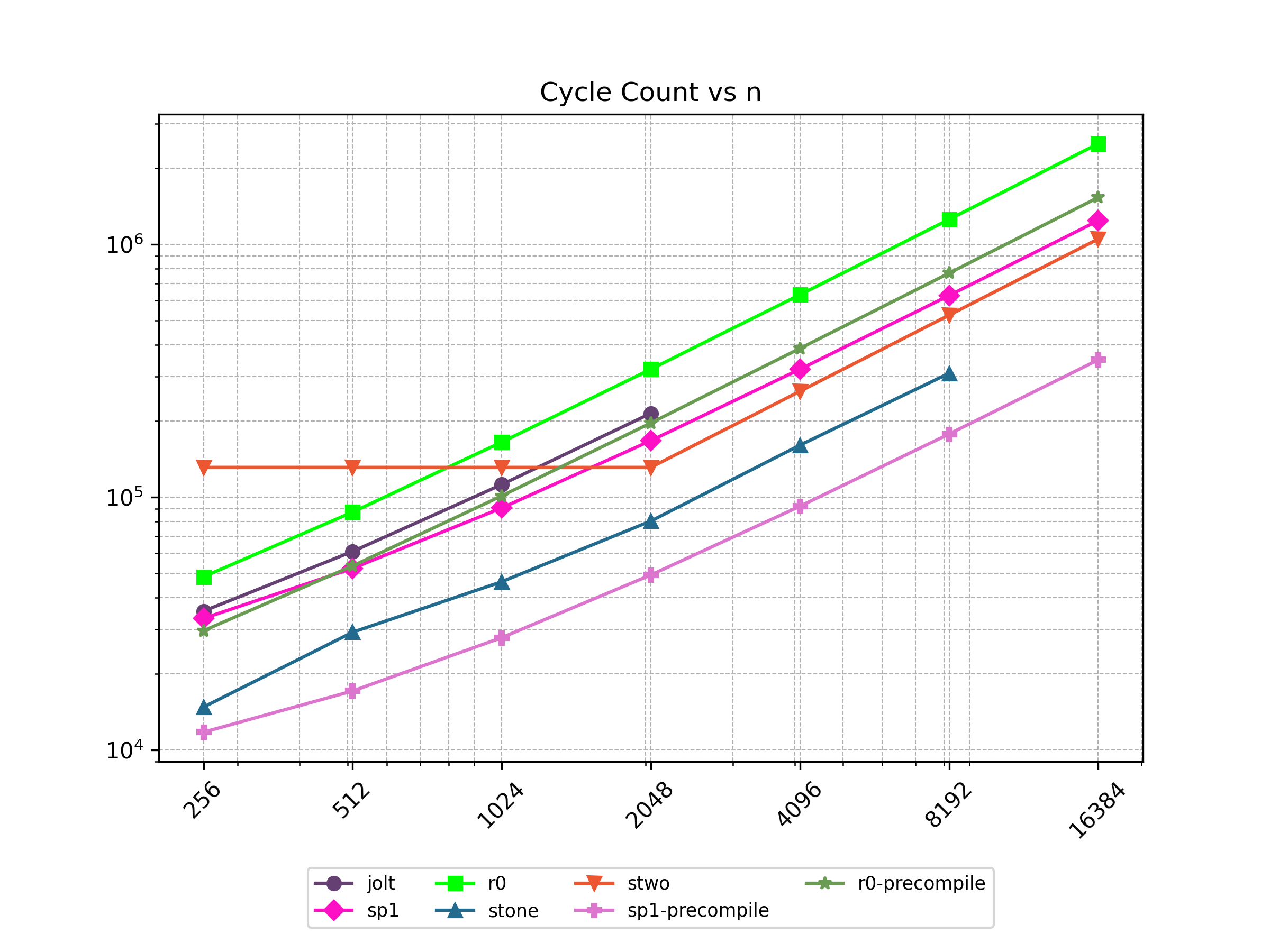 | n | jolt | sp1 | r0 | stone | stwo | sp1-precompile | r0-precompile |