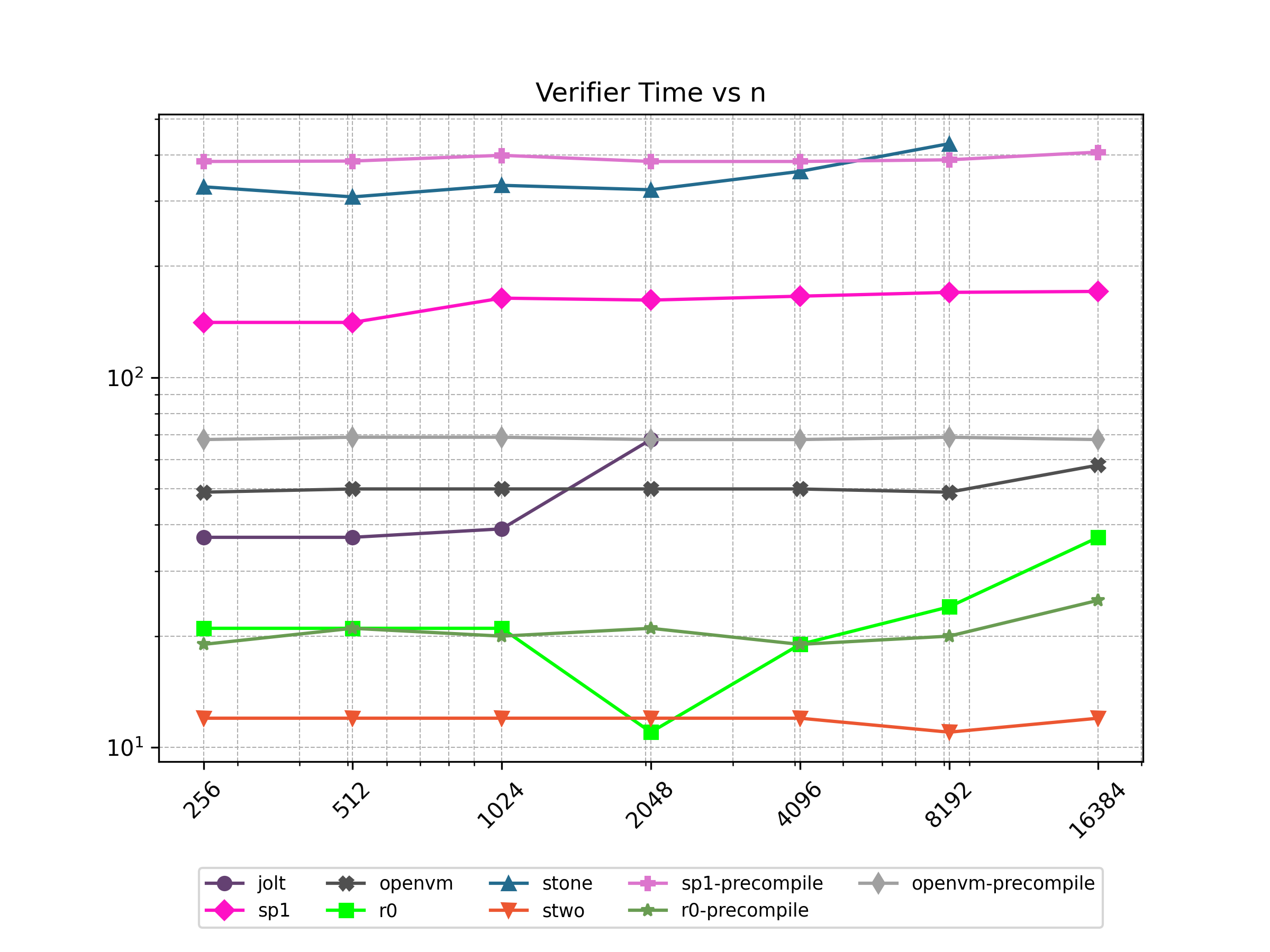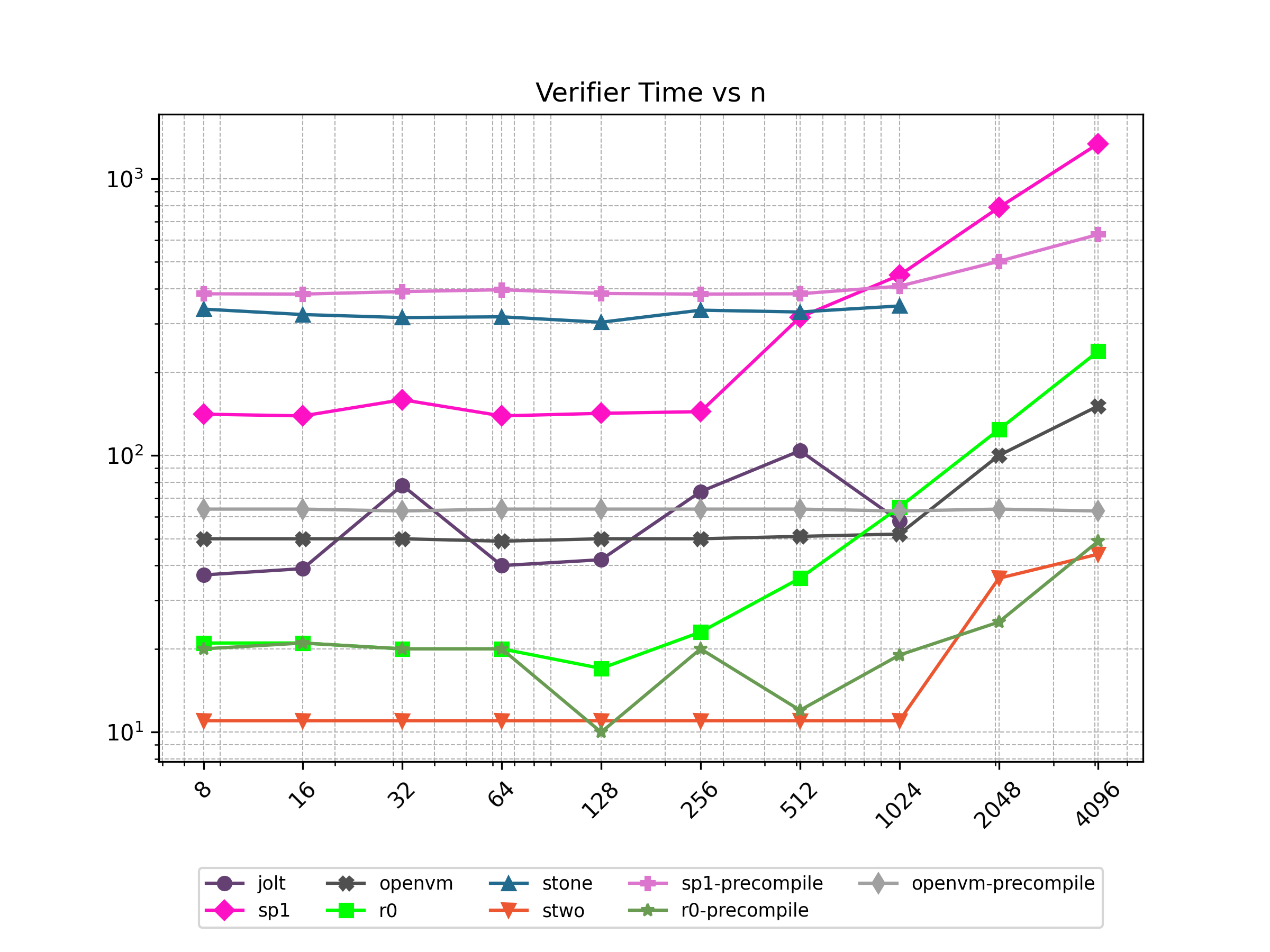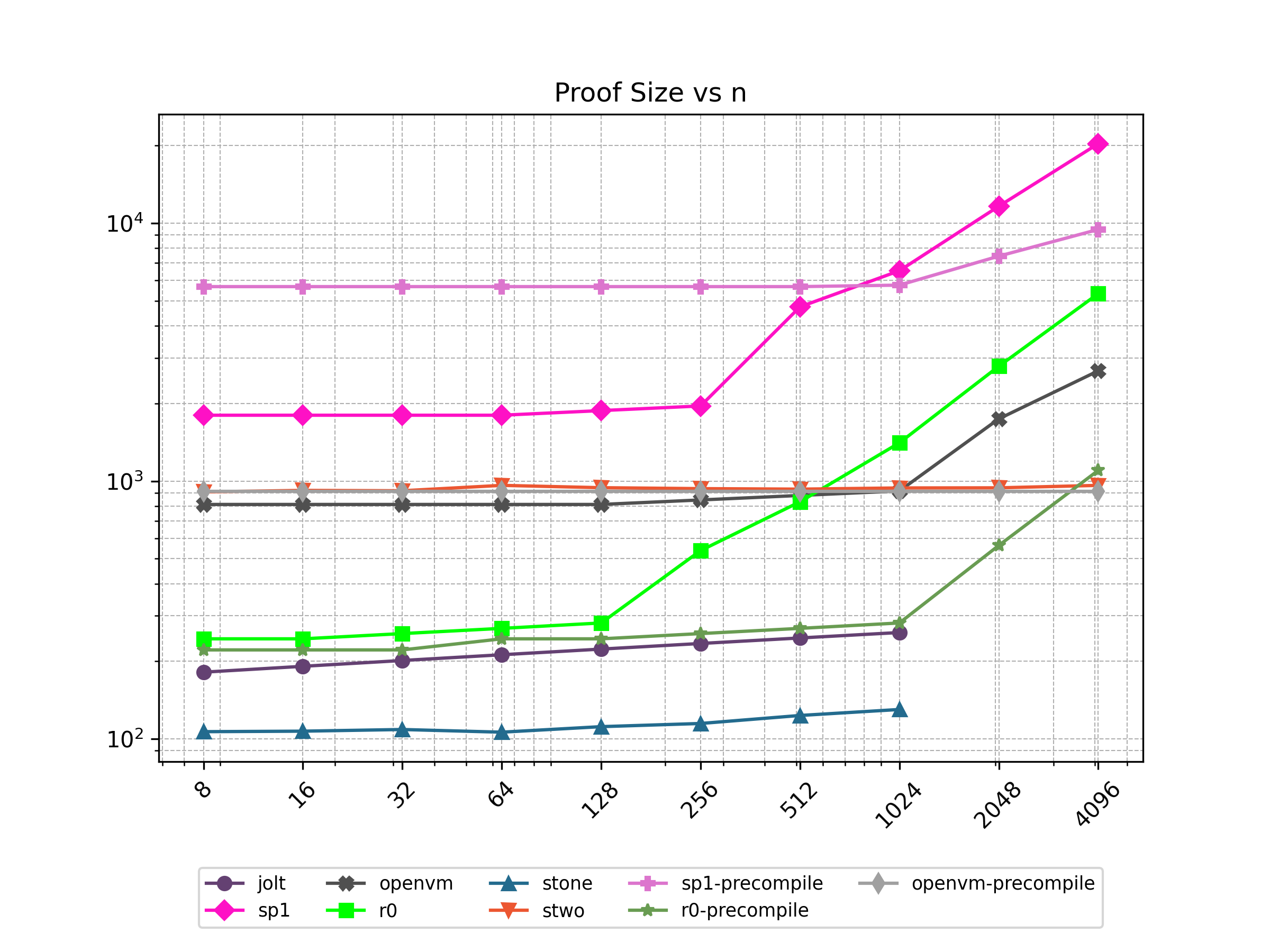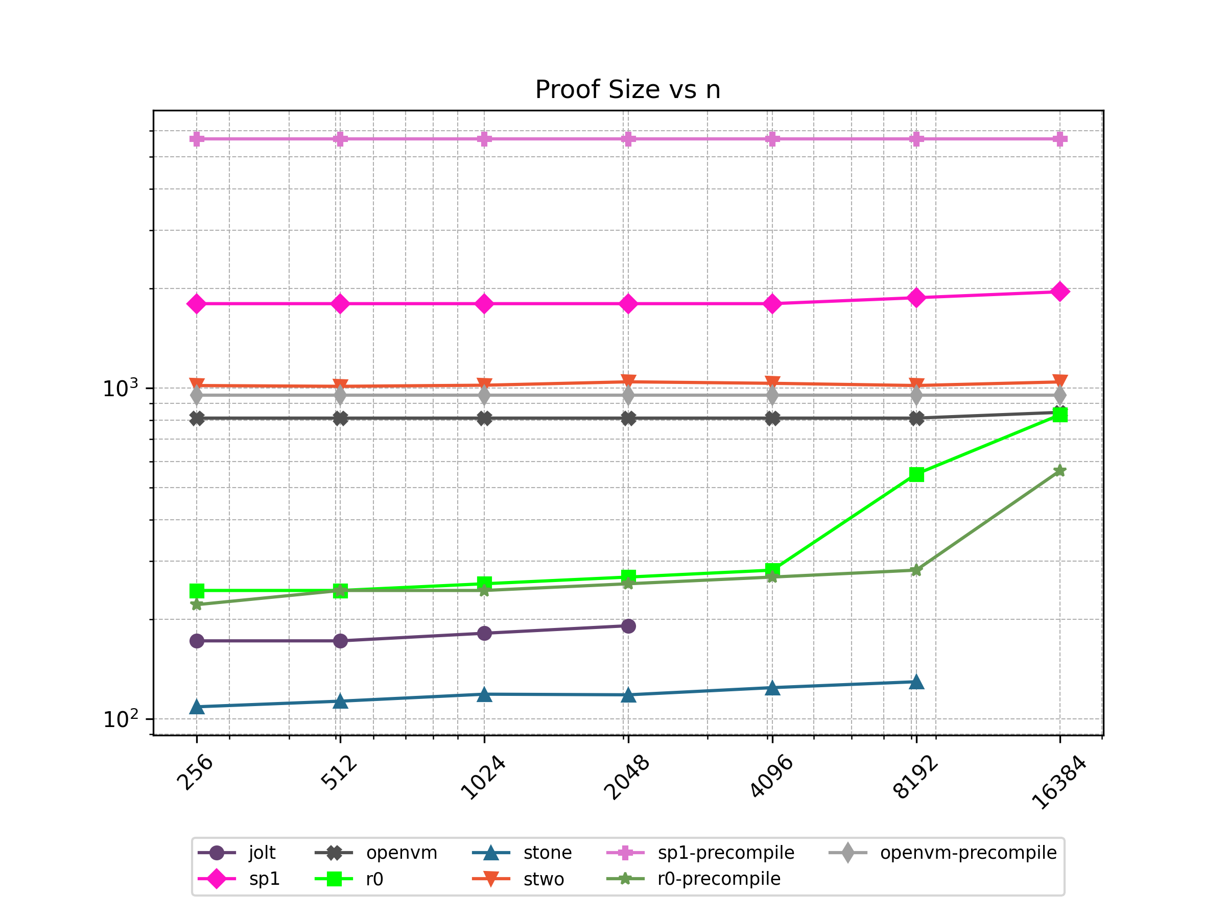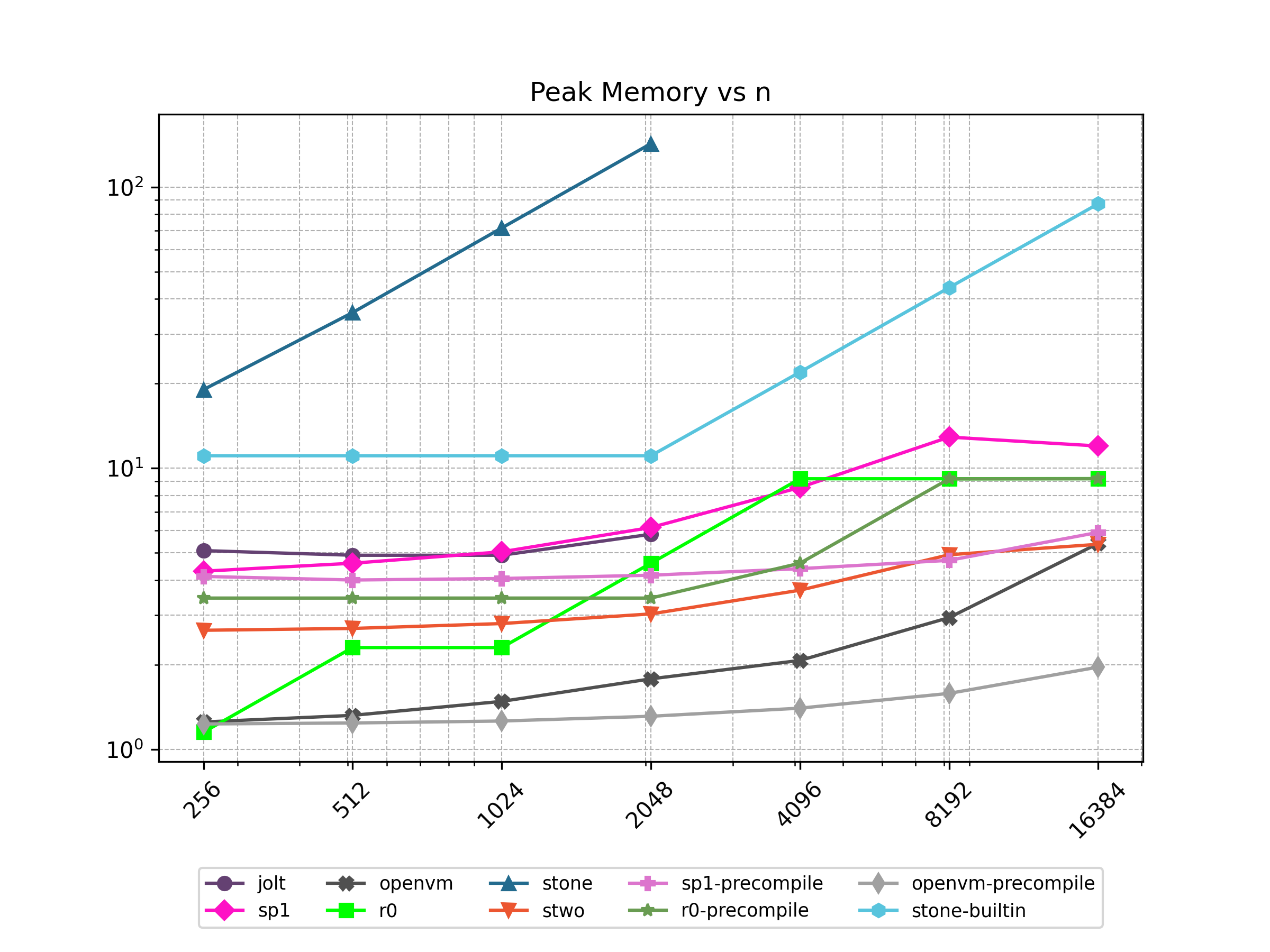 | n | jolt | sp1 | r0 | stone | stwo | sp1-precompile | r0-precompile |